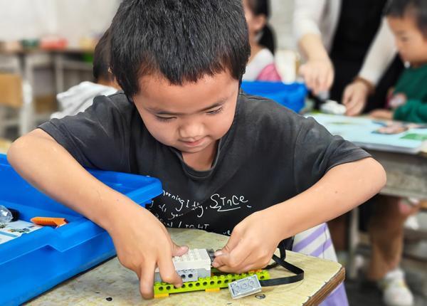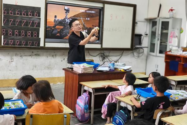 积木搭出“火星车”,编程点亮科学梦。活动中,教师党员邹源忠为瑶里村小学的同学们带来了一节精彩纷呈的人工智能体验课。他以“智能机器人——火星探险”为主题,向同学们讲解人工智能在航天领域的应用。“我们可以用积木拼出会动的火星探测器吗?”问题一出,孩子们的眼中就充满了好奇与期待。随后,在邹源忠的带领下,学生们围坐在课桌前,小手灵活地拼接起彩色积木。齿轮、传感器、马达……原本零散的零件在孩子们手中逐渐变身成了一辆辆“火星车”。